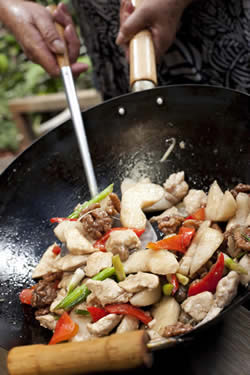 Wipe out your wok, add 2 tablespoons of oil and, on moderate heat, just as the oil begins to smoke, add a little Salt followed by the Capsicum, Spring Onion, Nashi and Mushrooms. Quickly stir-fry for 30 seconds before returning the Chicken, combining well.
